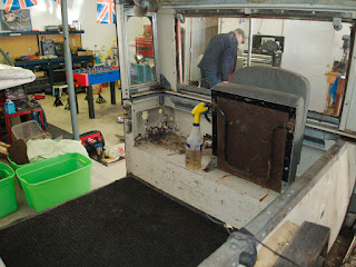 Please pass on my thanks to all those that came out today to help to strip down the Landy. We made a huge dent in it. Doors off and striped off locks, glass, etc. Front wings removed, front panel and rad, seat mounts, steering box and pitman arms, amazing in just 6 hours.